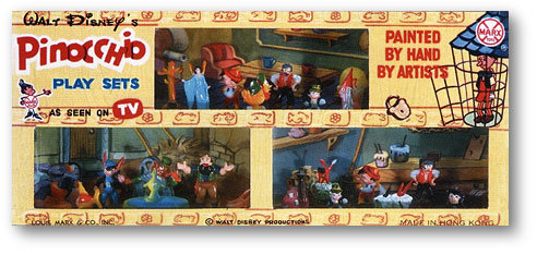 "Gepetto's Kitchen Scene" - includes (from l. to r.) Blue Fairy, Pinocchio, Gepetto & Jiminy Cricket. Flats include (from l. to r.) a coat rack, a toy chicken, a toy oil can and a large ice cream cone. |