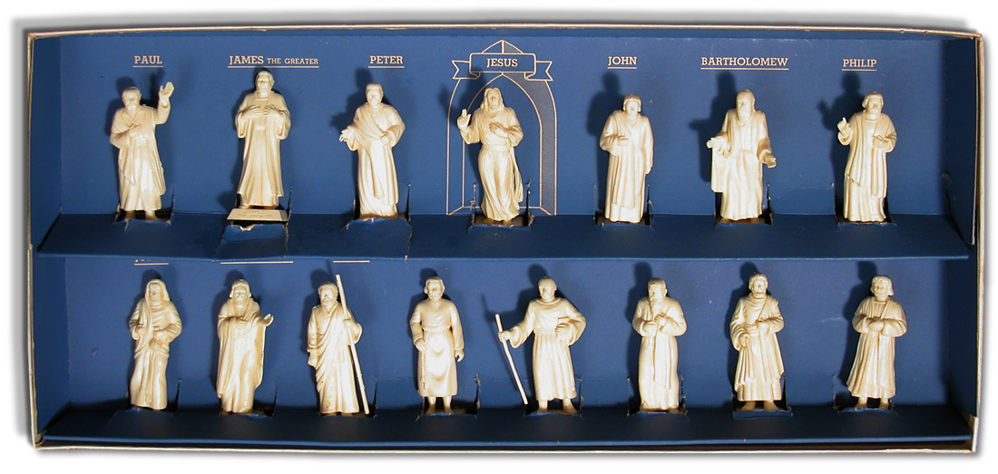The Religious Statuettes series' "Christ and his Apostles" box set hails from the early-to-mid 1950s. The packaging is very similar to the Marx Presidents series' original boxed sets. |